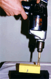 Step 2: With the block over a hole or soft surface, engage the drill at full speed and press firmly. Usually you will want to hold the block you are using.